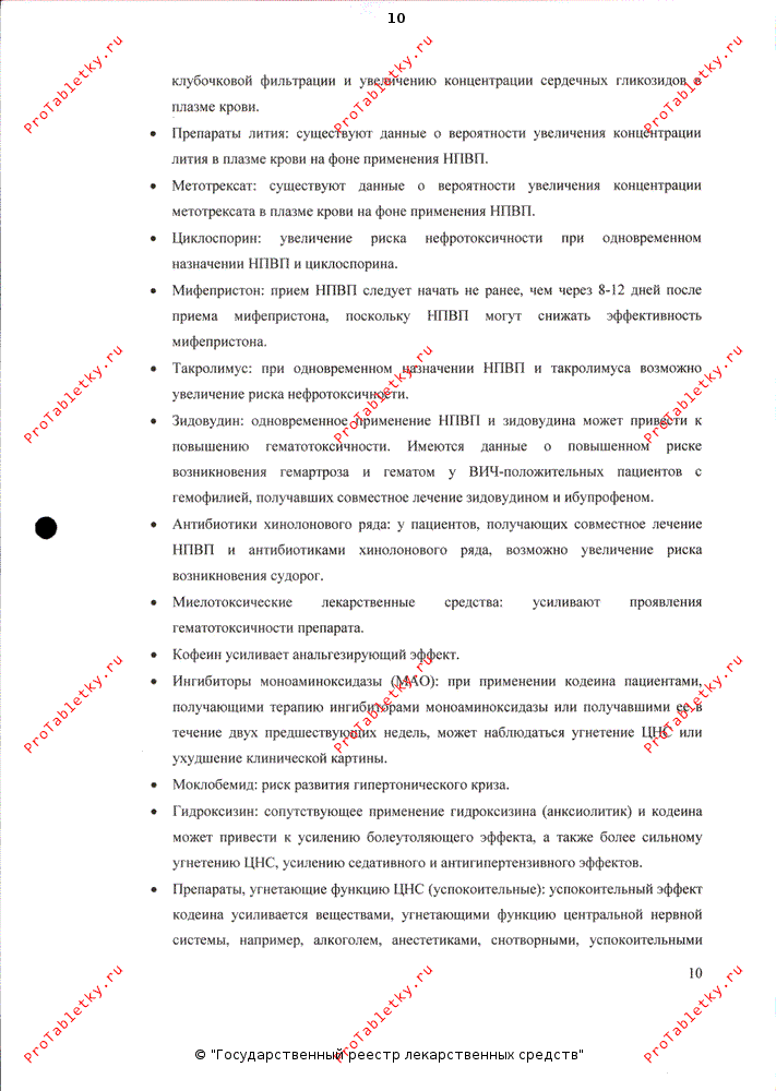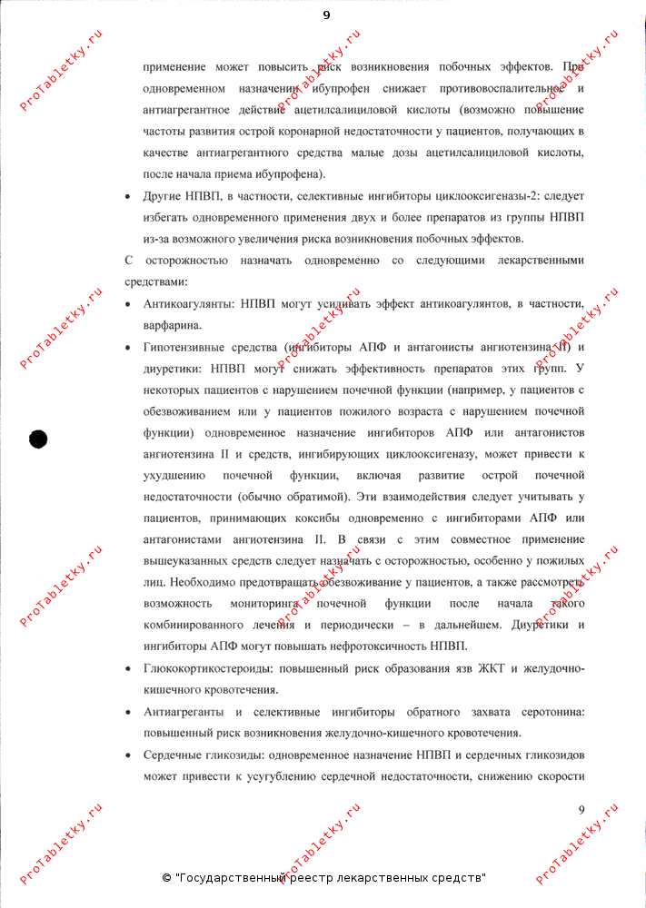 Гипотензивные средства (ингибиторы АПФ и антагонисты рецепторов ангиотензина II) и диуретики: НПВС могут снижать эффективность препаратов этих групп. У некоторых пациентов с нарушением почечной функции (например, у пациентов с обезвоживанием или у пациентов пожилого возраста с нарушением почечной функции) одновременное назначение ингибиторов АПФ или антагонистов рецепторов ангиотензина II и средств, ингибирующих ЦОГ, может привести к ухудшению почечной функции, включая развитие острой почечной недостаточности (обычно обратимой). Эти взаимодействия следует учитывать у пациентов, принимающих коксибы одновременно с ингибиторами АПФ или антагонистами рецепторов ангиотензина II. В связи с этим совместное применение вышеуказанных средств следует назначать с осторожностью, особенно у пожилых лиц. Необходимо предотвращать обезвоживание у пациентов, а также рассмотреть возможность мониторинга почечной функции после начала такого комбинированного лечения и периодически – в дальнейшем. Диуретики и ингибиторы АПФ могут повышать нефротоксичность НПВС.