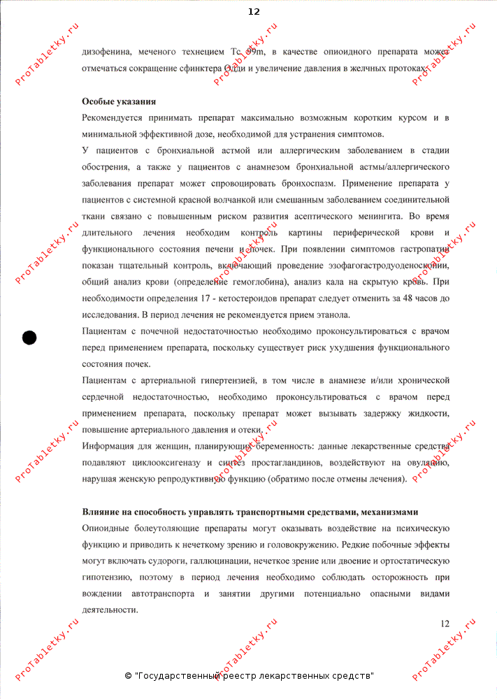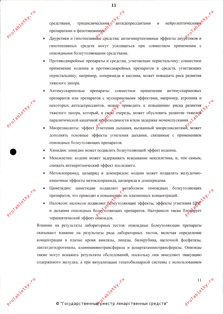 Влияние на результаты лабораторных тестов: опиоидные болеутоляющие препараты оказывают влияние на результаты ряда лабораторных тестов, включая определение концентрации в плазме крови амилазы, липазы, билирубина, ЩФ, ЛДГ, АЛТ и АСТ. Опиоиды также могут искажать результаты обследований, поскольку они замедляют эвакуацию содержимого желудка, а при визуализации гепатобилиарной системы с использованием дизофенина, меченого технецием 99Tcm, в качестве опиоидного препарата, может отмечаться сокращение сфинктера Одди и увеличение давления в желчных протоках.