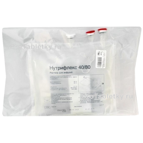 Нутрифлекс 40/80 представляет собой двухкамерный мешок, отделения которого разделены специальным швом. Одна камера заполнена раствором аминокислот и электролитов, а другая - раствором глюкозы и электролитов.