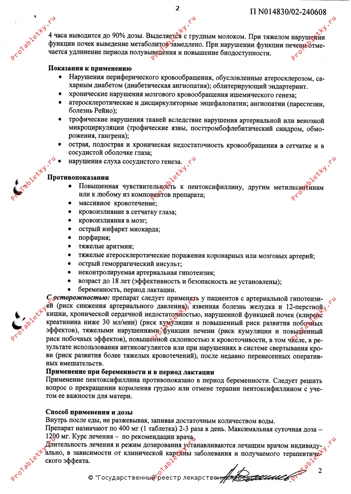 Достоверно увеличивает максимальную и безболевую дистанции ходьбы при перемежающейся хромоте. Входит в национальные рекомендации по ведению пациентов с заболеваниями артерий нижних конечностей. Иногда наблюдались нежелательные лекарственные реакции. У лиц в возрасте до 18 лет эффективность и безопасность мало изучены. Необходимо учитывать особенности взаимодействия препарата с другими лекарствами. Эффект препарата может наступать в промежутке от 2-й до 4-й недели, но лечение должно продолжаться как минимум 8 недель. При нарушениях функции почек или печени, возможно, потребуется коррекция режима дозирования. |