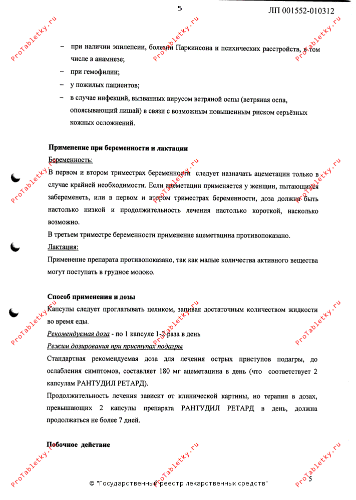 Стандартная рекомендуемая доза для лечения острых приступов подагры, до ослабления симптомов, составляет 180 мг ацеметацина в день (что соответствует 2 капсулам Рантудил Ретард).
