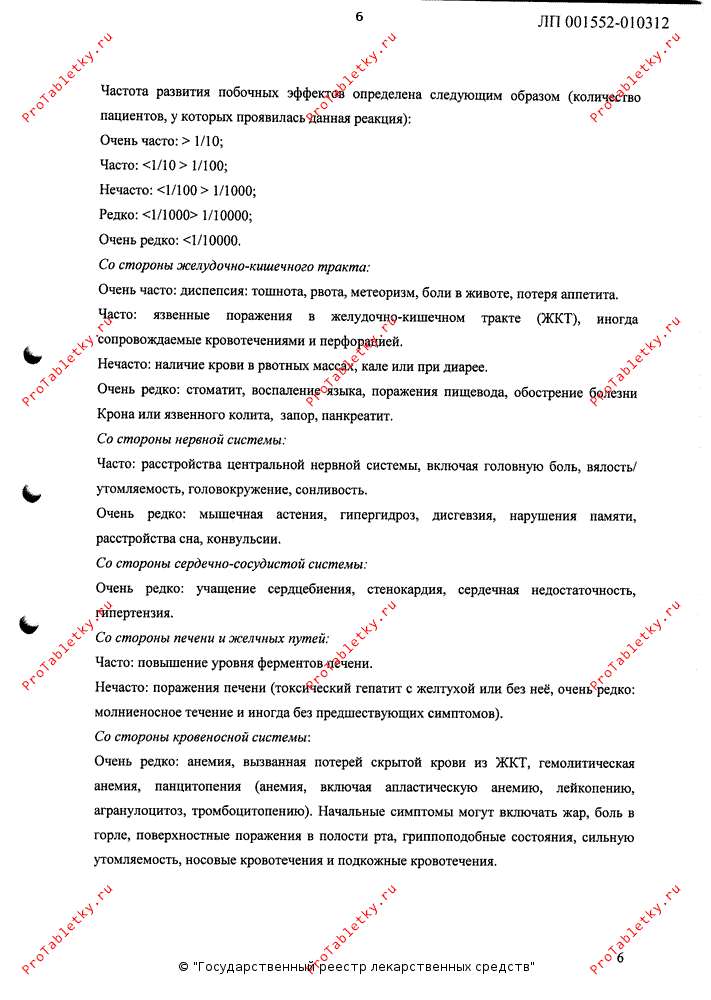Со стороны желудочно-кишечного тракта: очень часто - диспепсия: тошнота, рвота, метеоризм, боли в животе, потеря аппетита; часто: язвенные поражения в ЖКТ, иногда сопровождаемые кровотечениями и перфорацией; нечасто - наличие крови в рвотных массах, кале или при диарее; очень редко - стоматит, воспаление языка, поражения пищевода, обострение болезни Крона или язвенного колита, запор, панкреатит.