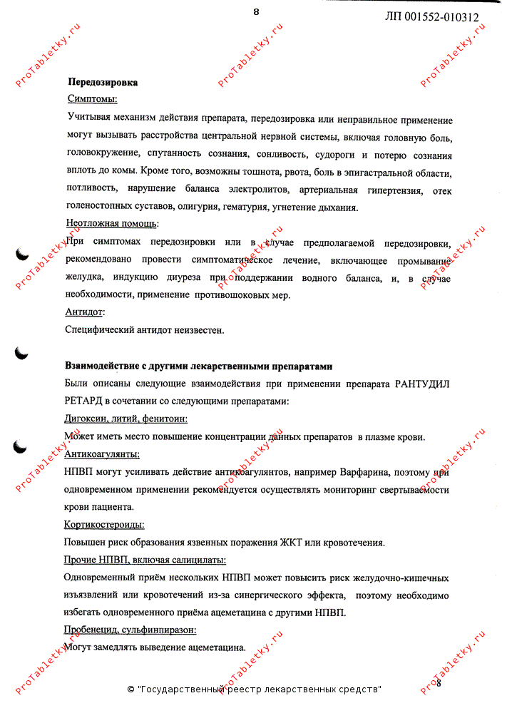 Продолжительность лечения зависит от клинической картины, но терапия в дозах, превышающих 2 капсулы препарата Рантудил Ретард в день, должна продолжаться не более 7 дней.
