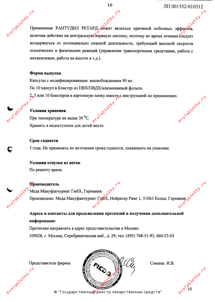 Применение Рантудил Ретард может являться причиной побочных эффектов, включая действие на ЦНС, поэтому во время лечения следует воздержаться от потенциально опасной деятельности, требующей высокой скорости психических и физических реакций (управление транспортными средствами, работа с механизмами, работа на высоте и т.д.).