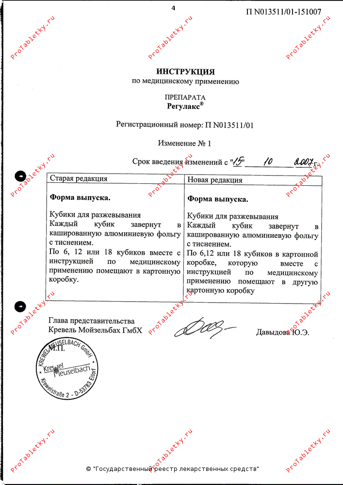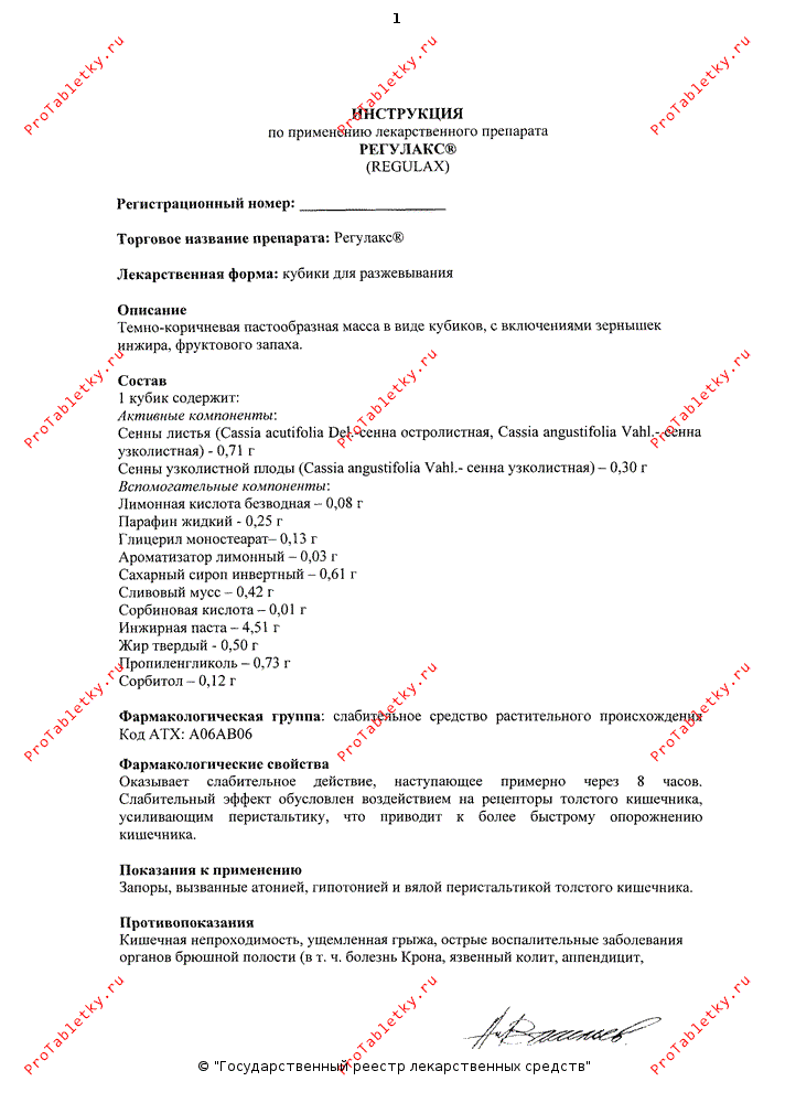 В фармакологической системе координат завернутые в алюминиевую фольгу с тиснением кубики регулакса, наверное, так же узнаваемы, как в гастрономической — кубики «Магги». Регулакс — известнейший брэнд в ряду слабительных средств, детище немецкой фармацевтической компании «Кревель Мойзельбах ГмбХ». Этот растительный препарат в качестве фармакологически активного компонента содержит фитотерапевтический «коктейль» в виде листьев сенны остролистной, листьев и плодов сенны узколистной. Дополнительно в состав регулакса входит целая россыпь вспомогательных веществ, позволяющих придать лекарственному веществу такую уникальную (в России более не зарегистрировано ни одного препарата в виде кубиков для разжевывания) форму: парафин, жир, пропиленгликоль и т.д., а также набор «вкусностей» вроде инжирной пасты, сливового мусса, сахарного сиропа.