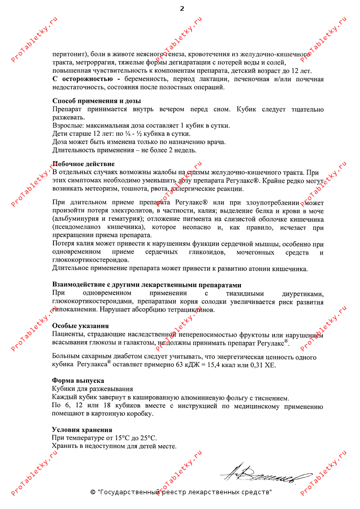 Первым шагом здесь является модификация образа жизни и рациона питания. Вторым (при отсутствии результатов) — назначение набухающих и осмотических слабительных средств вкупе с физиотерапевтическими процедурами, направленными на область тазового дна. И лишь потом наступает черед контактных (наиболее эффективных) слабительных средств, среди которых свое почетное место занимает регулакс. Его фармакологический эффект развивается спустя 8-12 часов после приема. Механизм действия регулакса заключается в возбуждении рецепторов слизистой оболочки стенки толстого кишечника, которая реагирует на столь бесцеремонное вторжение в свой неспешный жизненный уклад учащением и увеличением амплитуды перистальтических сокращений, что влечет за собой более быстрый выход кишечного содержимого наружу и восстанавливает прежнее функциональное состояние пищеварительного тракта. Регулакс не вызывает явления привыкания и не оказывает негативного влияния на процессы пищеварения. В актив данного препарата следует занести его без малого четвертьвековой опыт использования и уважительное (граничащее с тихим восторгом) отношение к нему гастроэнтерологов. В российской медицинской периодике даже приводилась статистика опроса врачей на предмет их предпочтений в назначениях при лечении запоров. Регулакс упомянули более 70% опрошенных. При всей относительности этой статистики следует признать, что определенную информацию к размышлению она все-таки дает. Конечно, на данном препарате свет клином не сошелся: на российских аптечных прилавках можно найти его более дешевые индийские аналоги (сенаде, глаксенна). Выбор в любом случае остается за пациентом, тем более препараты сенны можно приобрести в аптеке без рецепта врача.