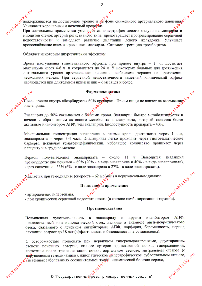 После приема внутрь абсорбция составляет 60%. Прием пищи не влияет на всасывание. В печени подвергается метаболизму с образованием активного метаболита эналаприлата. Связывание с белками плазмы крови для эналаприлата составляет 50-60%. Cmax эналаприла достигается через 1 ч, эналаприлата - через 3-4 ч. Эналаприлат плохо проникает через ГЭБ, в небольшом количестве - через плацентарный барьер и выделяется в небольшом количестве с грудным молоком. Выводится почками (до 60%, из них 20% - в виде эналаприла и 40% - в виде эналаприлата) и через кишечник (33%, из них 6% - в виде эналаприла и 27% - в виде эналаприлата).Форма выпуска