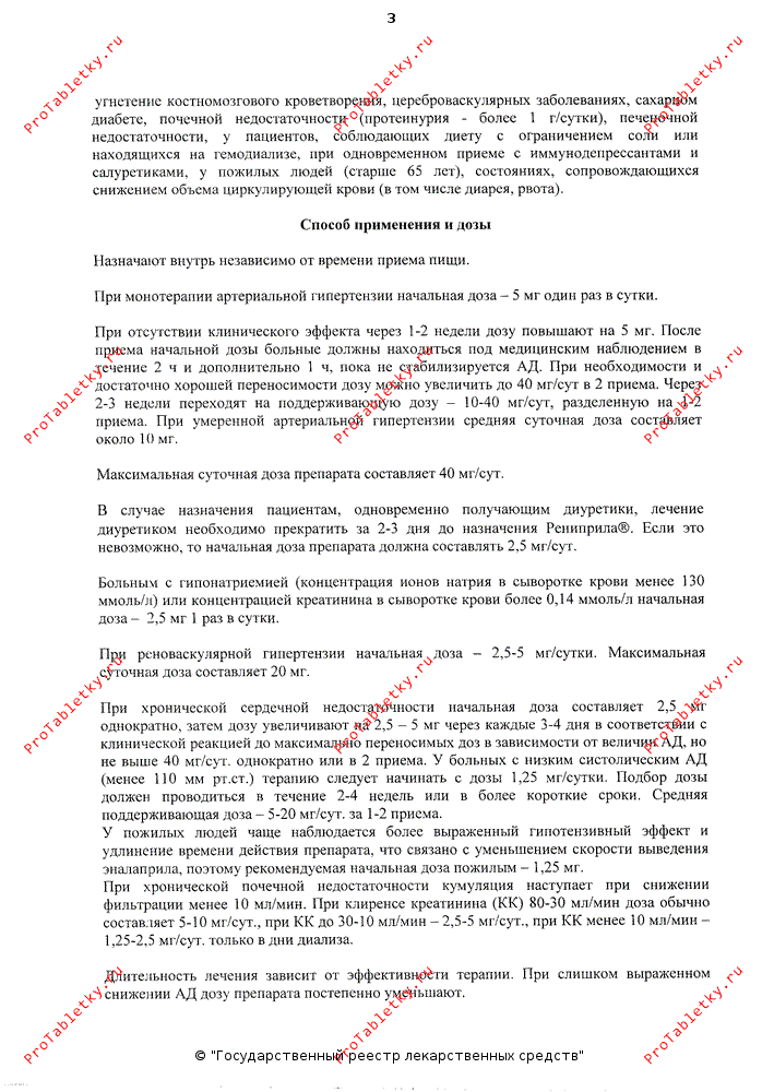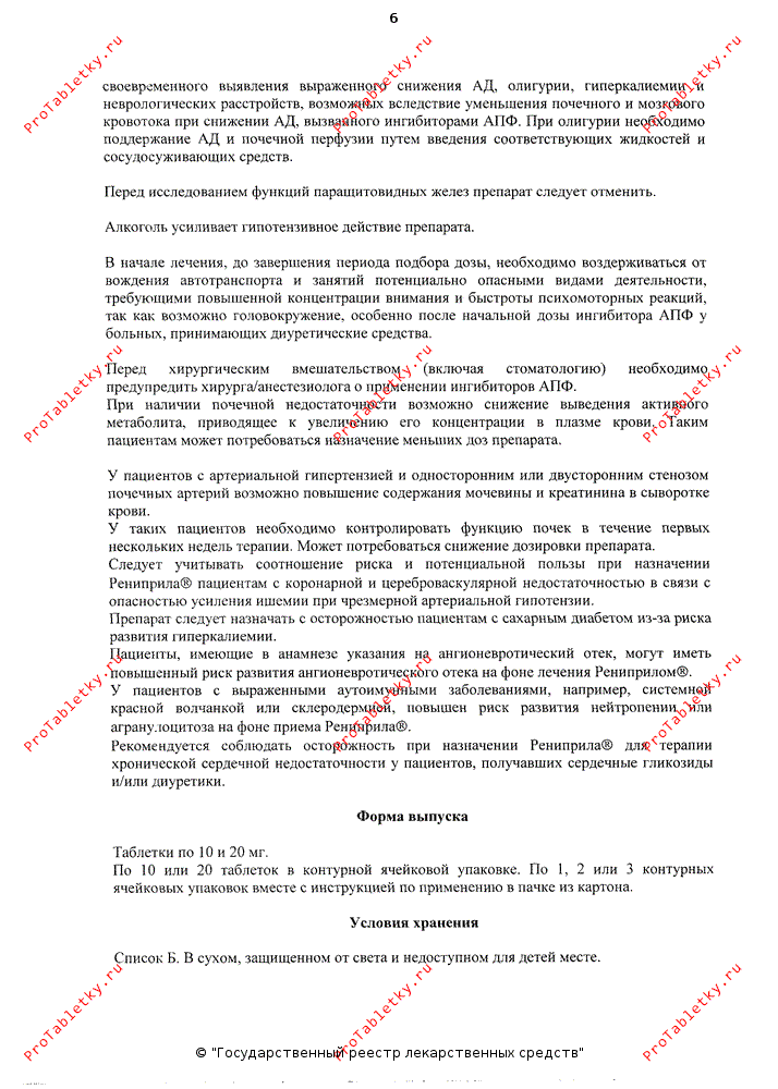 В дальнейшем доза корректируется в индивидуальном порядке. Умеренная артериальная гипертензия поддается лечению с использованием дозы в 10 мг в день. Что же до максимальной суточной дозы, то 80 мг — это тот порог, который перешагивать не рекомендуется. При реноваскулярной гипертензии (стойком повышении АД, вызванном нарушением почечного кровообращения) рениприл показан в меньших дозах: 5 мг — разовая (начальная) и 20 мг — максимальная суточная доза. Для лечения сердечной недостаточности препарат назначают в дозе 2,5 мг с последующим постепенным увеличением до 10-20 мг (дневная доза принимается за 1 раз или делится на 2 приема). Продолжительность медикаментозного курса определяется эффективностью лечения. Если артериальное давление у пациента начинает снижаться слишком стремительно, то доза препарата должна быть снижена. Рениприл можно применять как единственное средство антигипертензивной терапии или в различных фармакологических комбинациях. Пациенты с нарушением функции почек должны довольствоваться меньшими дозами или продлевать интервалы между приемами. У лиц с аутоиммунными заболеваниями, недостаточностью функции печени или почек, а также при обезвоживании и потере электролитов препарат следует применять с особой осторожностью. Если лечению рениприлом предшествовал фармакотерапевтический курс, включающий прием диуретиков, то ввиду риска развития гипотензии необходимо восстановить в организме водно-электролитный баланс. Длительное лечение рениприлом предусматривает регулярный контроль показателей периферической крови.