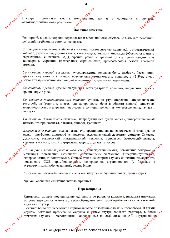 Рениприл в целом хорошо переносится и в большинстве случаев не вызывает побочных реакций, требующих отмены препарата.