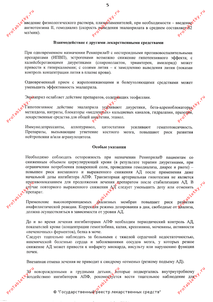 При одновременном назначении Рениприла и НПВС возможно снижение эффективности Рениприла; с калийсберегающими диуретиками (спиронолактон, триамтерен, амилорид) – возможно развитие гиперкалиемии; с солями лития – замедление выведения лития (показан контроль концентрации лития в плазме крови).