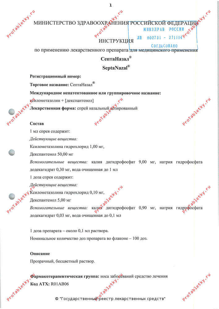 Септаназал - назальный сосудосуживающий спрей. Назначаю в комплексной терапии, при ОРВИ, простудах, аллергических состояниях у детей. Хорошо снимает симптомы болезни на начальной стадии ее развития буквально на 1-2 дня острой фазы, да в составе есть дексапантенол, для тех, у кого идет раздражение на спреи хорошая альтернатива заменить на септаназал, который быстро восстановит слизистую кожи носа. Препарат работает, назначаю. | |||||||||
