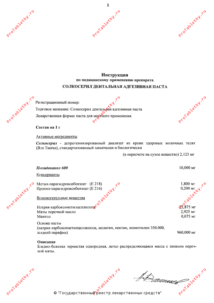 Дополнительным компонентом дентальной адгезивной пасты солкосерила является полидоканол 600 — местное обезболивающее средство, действие которого реализуется на уровне периферических нервных окончаний, вызывая их временное блокирование. Данное вещество оказывает быстрый и длительный локальный обезболивающий эффект. После нанесения дентальной пасты на слизистую оболочку полости рта боль купируется уже спустя 2-5 минут, при этом данный эффект сохраняется еще в течение 3-5 часов. Дентальная паста солкосерила образует протективный лечебный слой на пораженном участке слизистой полости рта и эффективно защищает ее от разного рода повреждений. Между тем, данная лекарственная форма имеет ряд ограничений к использованию: так, ее не рекомендуется закладывать в полость, образующуюся после удаления зубов мудрости, коренных зубов и резекция верхушки зуба (в последнем случае — если после стягивания краев лунки накладываются швы). В состав пасты не входят антибактериальные компоненты, поэтому, при инфекционном поражении слизистой рта перед применением солкосерила необходимо провести превентивную медикаментозную «зачистку» с целью устранения возбудителя инфекции и снятия воспалительной симптоматики.