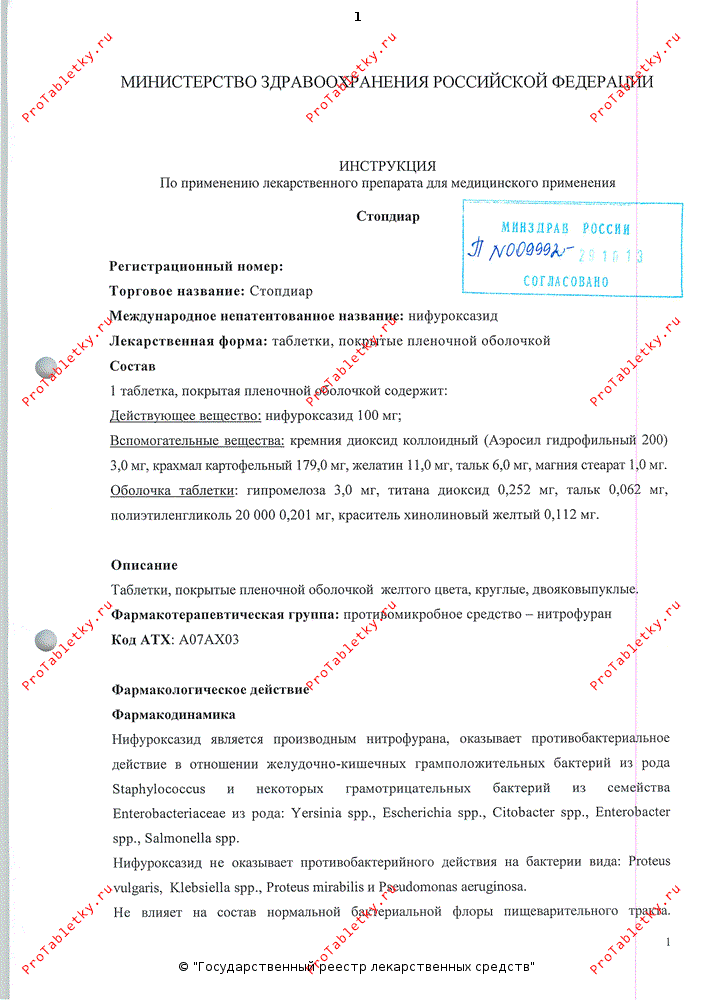 Стопдиар (действующее вещество — нифуроксазид) — противодиарейное лекарственное средство, производное нитрофурана. Обладает противомикробной активностью в отношении бактерий желудочно-кишечного тракта, среди которых встречаются как грамположительные (Staphylococcus spp.), так и грамотрицательные (Escherichia spp., Enterobacter spp., Citobacter spp., Yersinia spp., Salmonella spp.) «персонажи». Стопдиар бессилен при инфекциях, вызванных Klebsiella spp., Proteus mirabilis, Proteus vulgaris и Pseudomonas aeruginosa. Препарат не влияет на «мирных» представителей бактериальной флоры кишечника. Механизм действия стопдиара доподлинно не известен. Полагают, что нифуроксазид подавляет активность дегидрогеназ и биосинтез белка в бактериальных клетках. Устойчивость к действию препарата развивается крайне редко. Это касается и перекрестной устойчивости к другим противомикробным лекарственным средствам. Эффективность стопдиара не зависит ни от кислотно-щелочного соотношения в просвете кишечника, ни от реактивности бактерий к противомикробным препаратам. Стопдиар в очень незначительной степени абсорбируется в желудочно-кишечном тракте, действуя сугубо в просвете кишечника.
