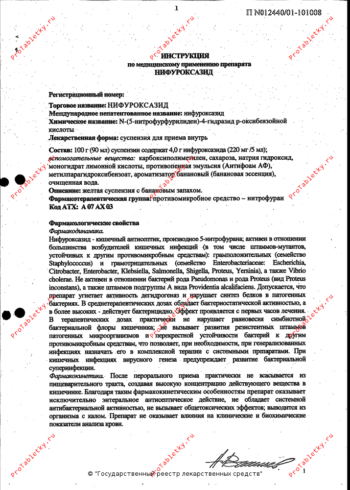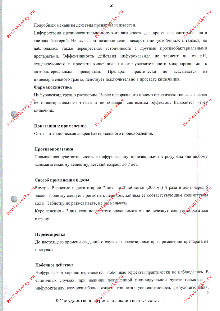 Противодиарейный препарат. Нифуроксазид - производное нитрофурана, оказывает антибактериальное действие в отношении желудочно-кишечных грамположительных бактерий Staphylococcus spp. и некоторых грамотрицательных бактерий - Yersinia spp., Escherichia spp., Citobacter spp., Enterobacter spp., Salmonella spp.