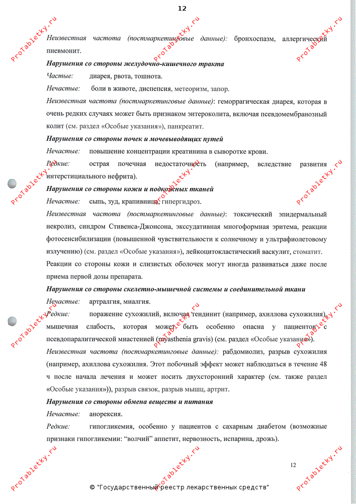 Со стороны кожи и подкожных тканей: нечасто - сыпь, зуд, крапивница, гипергидроз; частота неизвестна (постмаркетинговые данные) - токсический эпидермальный некролиз, синдром Стивенса-Джонсона, экссудативная многоформная эритема, реакции фотосенсибилизации (повышенной чувствительности к солнечному и УФ излучению), лейкоцитокластический васкулит. Реакции со стороны кожи и слизистых оболочек могут иногда развиваться даже после введения первой дозы препарата.