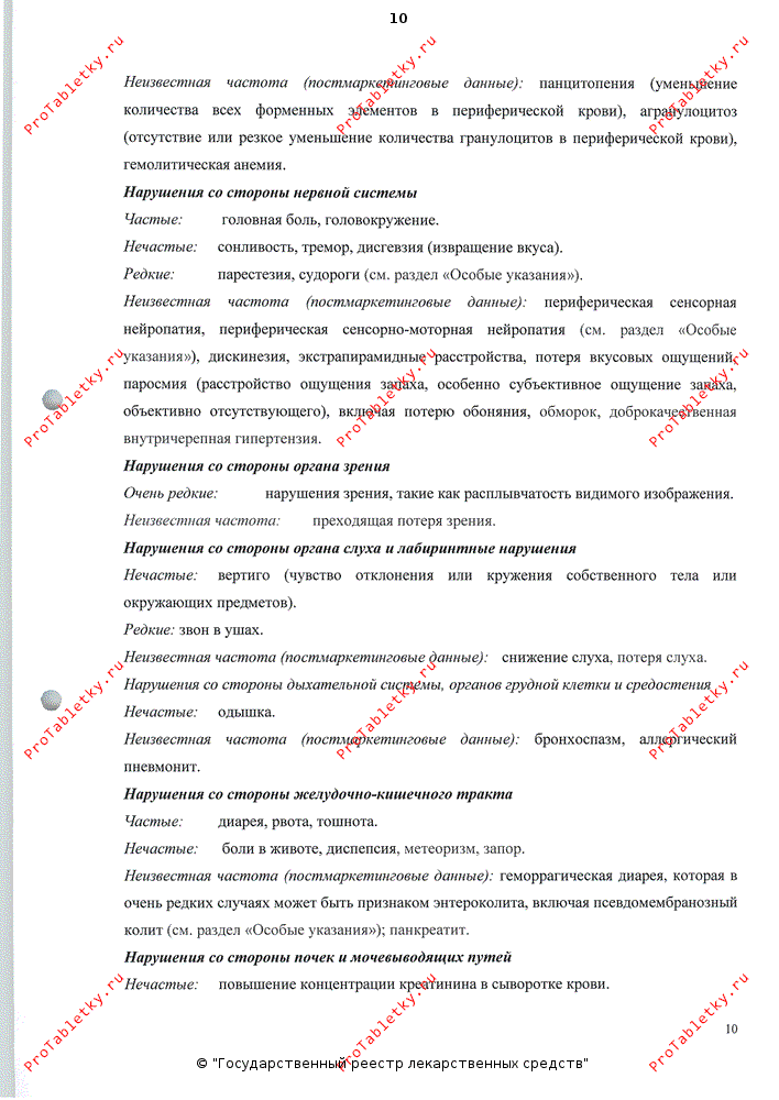 Со стороны мочевыводящих путей: нечасто - повышение концентрации креатинина в сыворотке крови; редко - острая почечная недостаточность (например, вследствие развития интерстициального нефрита).