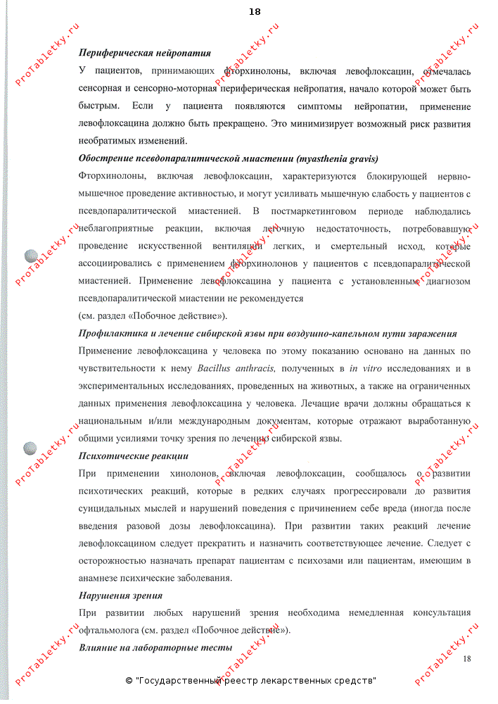 У пациентов, получающих фторхинолоны, включая левофлоксацин, отмечалась сенсорная и сенсорно-моторная периферическая невропатия, начало которой может быть быстрым. Если у пациента появляются симптомы невропатии, применение левофлоксацина следует прекратить. Это минимизирует возможный риск развития необратимых изменений.