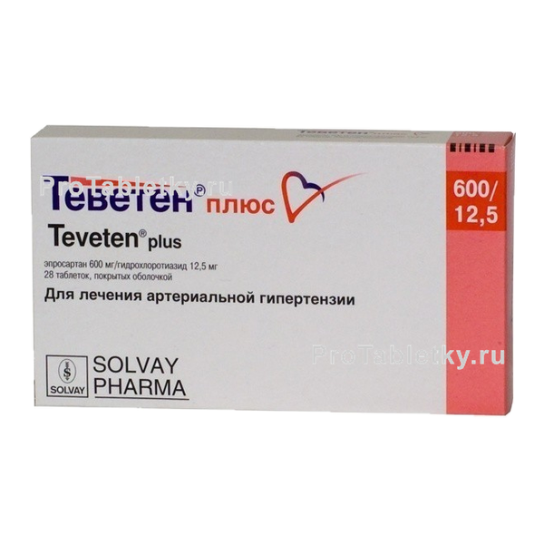 Наличие в ЖКТ пищевого содержимого не влияет на биодоступность действующих веществ лекарственного средства, но замедляет их всасывание. Теветен Плюс не применяют при индивидуальной непереносимости любого активного или вспомогательного компонента, при выраженной почечной недостаточности, двустороннем сужении почечных артерий, в период беременности и кормления грудью. В педиатрической практике не используется в связи с недостаточностью клинических данных об эффективности и безопасности препарату данной категории пациентов. Разовая доза – 1 таблетка. Оптимальное время приема – утреннее. Пожилые лица, а также пациенты с нетяжелыми функциональными нарушениями печени и почек принимают лекарственное средство на общих основаниях, снижения дозы не требуется. Наиболее распространенные (в 1-10% случаев) нежелательные побочные реакции, связанные с приемом Теветена Плюс: вертиго, кожные высыпания, ощущение болезненно-щекочущего раздражения кожи, вызывающее потребность чесать раздражённое место, тягостное ощущение в подложечной области, груди, полости рта и глотке, предшествующее рвоте (а также, собственно, рвота), учащенные (чаще трех раз в день) дефекации водянистым стулом, астенические явления. Антигипертензивный эффект лекарственного средства может потенцироваться при совместном его использовании с другими антигипертензивными препаратами. НПВС могут ослаблять диуретический и антигипертензивный эффекты Теветена Плюс. Калийсберегающие диуретики могут ослаблять антигипертензивный эффект Теветена Плюс. Эпросартан сочетается с антагонистами кальция без возрастания риска развития нежелательных побочных реакций. Гидрохлоротиазид при совместном применении может повышать вероятность развития побочных эффектов сердечных гликозидов и лекарственных средств, используемых при нарушениях сердечного ритма. Гидрохлоротиазид может потенцировать эффекты тубокурарина, пипекурония и других недеполяризующих миорелаксантов.