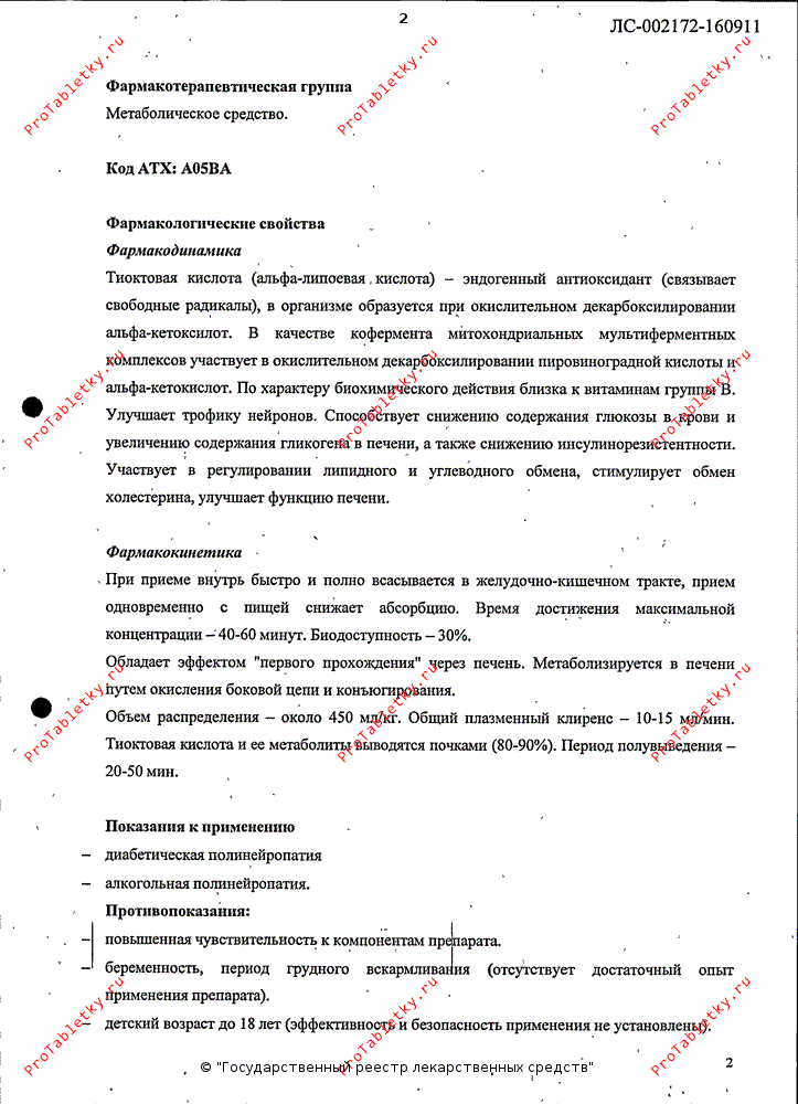 Отечественное лекарственное средство тиолепта (фармакологически активное вещество — тиоктовая кислота) — это эндогенный антиоксидант, инактивирующий свободные радикалы и регулирующий метаболизм липидов и углеводов. В клинической практике применяется при полиневропатиях: диабетической и алкогольной. В последние десятилетия рост числа пациентов, страдающих сахарным диабетом, может не заметить лишь только бесконечно далекий от медицины человек. И если в 2000 году это тяжелое заболевание было указано в амбулаторных картах 170 миллионов жителей Земли, то в 2012 — уже у 366 миллионов. Одним из поздних осложнений сахарного диабета является диабетическая полиневропатия, проявляющаяся тотальным поражением периферических нервов. По статистике данная патология имеет место примерно у 30% диабетиков. Интенсивное лечение инсулином может снизить риск развития диабетической невропатии, но полностью предупредить ее подобным образом не представляется возможным. Средством, чья эффективность в отношении диабетической невропатии на данный момент имеет наибольшую доказательную базу, является тиоктовая (альфа-липоевая) кислота или тиолепта. Главную роль в патогенезе диабетической невропатии играет окислительный стресс, биохимическим «оружием» которого являются свободные радикалы. Доклинические исследования тиоктовой кислоты, проводимые на лабораторных животных, продемонстрировали, что данное вещество уменьшает количество свободных радикалов (включая супероксид), снижает интенсивность протекания процесса перекисного окисления липидов, стимулирует эндоневральное кровообращение, увеличивает скорость распространения возбуждения по периферическим нервным волокнам, повышает утилизацию глюкозы клетками миокарда, подавляет развитие катаракты, предупреждает гломерулярные заболевания почек. В клинических испытаниях с использованием тиоктовой кислоты у пациентов с сахарным диабетом наблюдалась активизация кровотока в микроциркуляторном русле, подавление перекисного окисления липидов, нормализация содержания в крови оксида азота и стресс-белков (белки, синтезируемые в условиях различных физиологических стрессов), улучшение почечной фильтрации, повышение утилизации глюкозы.