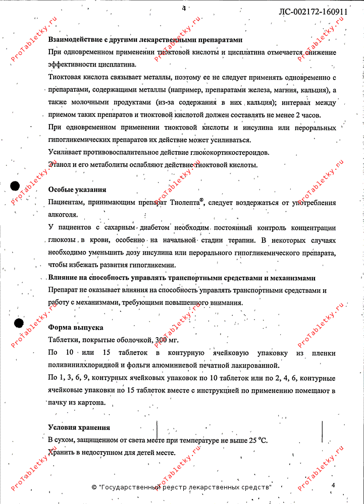 Тиолепта выпускается в таблетках (на данный момент лекарственная форма препарата в виде раствора для внутривенных инфузий не зарегистрирована в РФ). При пероральном приеме быстро и в полном объеме абсорбируется в желудочно-кишечном тракте. Максимальная концентрация действующего вещества в крови отмечается спустя 40-60 минут от момента приема препарата. Тиолепту назначают по 600 мг (1-2 таблетки) 1 раз в день. Принимать препарат следует в утренние часы, обязательно натощак (одновременный прием пищи снижает скорость всасывания), примерно за полчаса до первого приема пищи, запивая достаточным количеством воды. Продолжительность медикаментозного курса определяется врачом индивидуально. Пациентам с сахарным диабетом во время фармакотерапии показан регулярный контроль за уровнем глюкозы в крови (особенно это касается начальной стадии лечения). В отдельных случаях во избежание гипогликемии доза инсулина или таблетированного сахаропонижающего средства может быть уменьшена. Во время лечения препаратом тиолепта следует воздерживаться от спиртного.