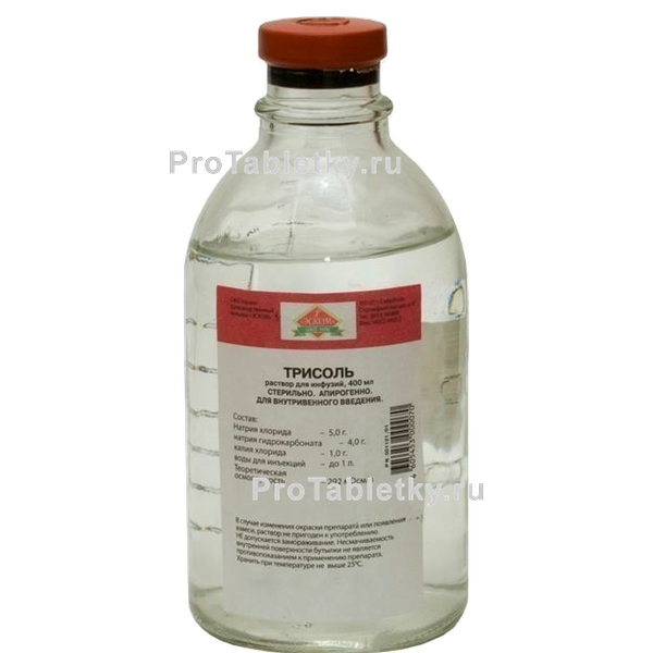 Трисоль – средство, восстанавливающее водно-солевой баланс, т.е. равновесие анионов (калий, натрий и пр.) и катионов (органические кислоты, хлор и т.д.) в организме человека. Восполняет дефицит плазмы крови или отдельных е компонентов. Препятствует развитию гиповолемии – патологического состояния, характеризующегося снижением объема крови, циркулирующей в кровеносном русле, аномальным теледиастолическим давлением, что в свою очередь приводит к уменьшенному минутному объему крови и снижению миокардиальной перфузии. Увеличивает количество выделяемой мочи. Уменьшает вязкость крови. Препятствует избыточному накоплению кислот вследствие их повышенного образования или потребления, сниженной элиминации из организма или потери гидрокарбонат-иона через пищеварительный тракт или почки. Нормализует движение крови в системе микроциркуляции, центральной частью которой являются капилляры. Используется при патологических состояниях, связанных с дегидратацией и поражением организма токсинами (в т.ч. острый шигеллез, пищевой бактериотоксикоз, холера Эль-Тор и т.д.). Противопоказан лицам, у которых почки полностью или частично утратили способность образовывать или выделять мочу, декомпенсацией сердечной деятельности, повышенным содержанием ионов калия в крови, индивидуальной непереносимостью препарата. Вводится непосредственно в венозный сосуд с обязательным мониторингом лабораторных показателей. Введение может быть струйным (при заболеваниях, протекающих в тяжелых формах) или капельным.