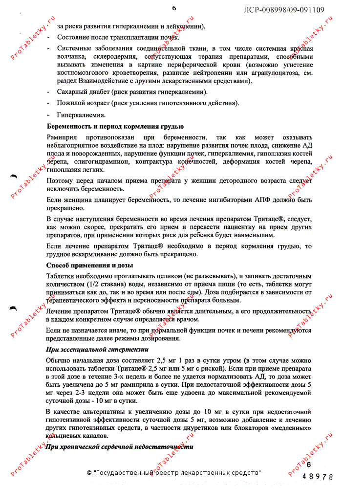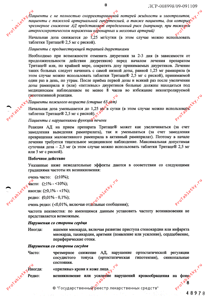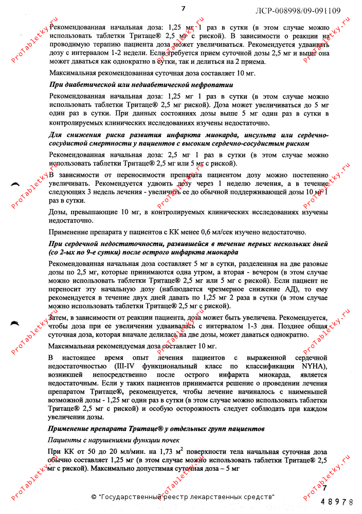 При КК от 50 до 20 мл/мин начальная суточная доза обычно составляет 1.25 мг (в этом случае можно использовать 1/2 таблетки Тритаце® 2.5 мг с риской). Максимально допустимая суточная доза - 5 мг