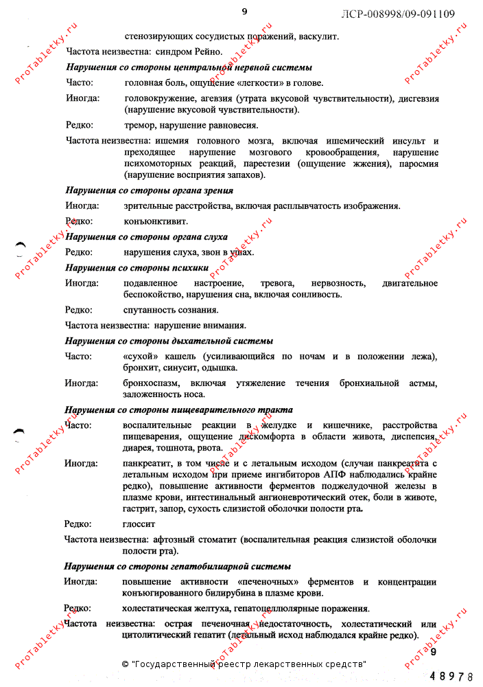 Со стороны пищеварительной системы: часто - воспалительные реакции в желудке и кишечнике, расстройства пищеварения, ощущение дискомфорта в области живота, диспепсия, диарея, тошнота, рвота; иногда - панкреатит, в т.ч. с летальным исходом (случаи панкреатита с летальным исходом при приеме ингибиторов АПФ наблюдались крайне редко), повышение активности ферментов поджелудочной железы в плазме крови, интестинальный ангионевротический отек, боли в животе, гастрит, запор, сухость слизистой оболочки полости рта; редко - глоссит; частота неизвестна - афтозный стоматит (воспалительная реакция слизистой оболочки полости рта).