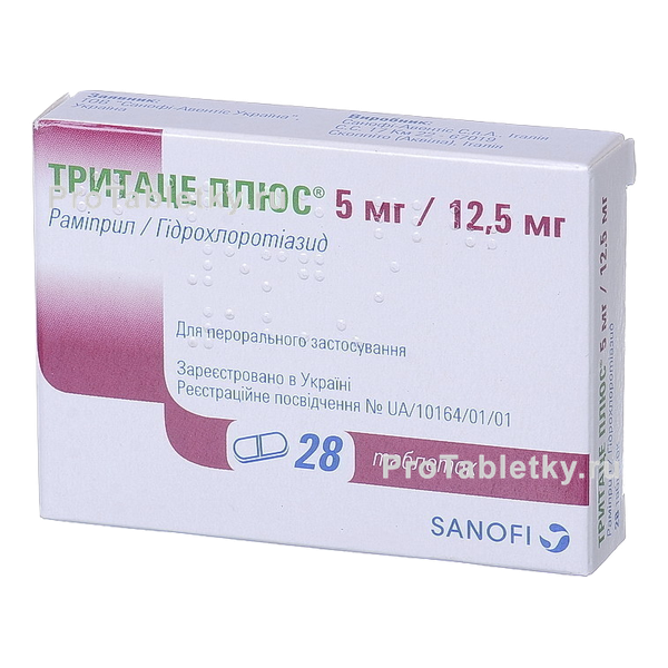 Своего пика диуретический эффект препарата достигает через 3-6 часов и поддерживается на клинически значимом уровне до 12 часов. Гипотензивный эффект становится клинически значимым через 3-4 дня от начала приема гидрохлоротиазида. При продолжительном медикаментозном курсе достижение целевого уровня АД становится возможным при применении меньших доз, требующихся для достижения диуретического эффекта. Рамиприл быстро абсорбируется в гастроинтестинальном тракте. Наличие в ЖКТ пищевого содержимого на скорость и степень абсорбции не влияет. В печени превращается в рамиприлат. Период полужизни составляет около 5 часов. Элиминация из организма осуществляется вместе с мочой (60%) и калом (40%). Пиковая концентрация гидрохлоротиазида в крови достигается через 1-3 часа после приема. Метаболическим трансформациям не подвергается и выводится почками в исходном виде. Период полужизни варьируется в диапазоне от 10 до 15 часов (у лиц с почечной недостаточностью – около 34 часов). Кратность приема Тритаце Плюс – 1 раз в день, оптимальное время приема – по утрам. Перед приемом комбинированного лекарственного средства необходимо подобрать дозу каждого из ингредиентов препарата по отдельности. На начальном этапе фармакотерапии и после повышения дозировки может отмечаться выраженная гипотония, а также ощущение нарушения положения тела в пространстве, общая слабость, размытость зрения. Другие наиболее вероятные побочные эффекты, связанные с применением лекарственного средства: цефалгия, утомляемость, апатия, желание уснуть в непредназначенное для этого время, конъюнктивит, блефарит, отек лодыжек, непродуктивный кашель, бронхит, тошнота, эпигастральные боли, диспепсические явления, потеря аппетита, констипация, диарея, повышение чувствительности к ультрафиолету, снижение полового влечения. При наступлении выраженной гипотонии пациенту следует принять горизонтальное положение и приподнять нижние конечности (при необходимости – ввести раствор хлорида натрия).