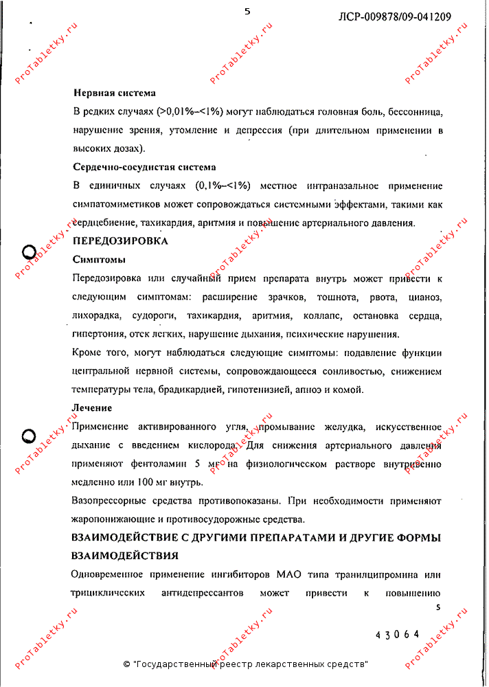 Со стороны сердечно-сосудистой системы: в единичных случаях (0.1%, <1%) местное интраназальное применение симпатомиметиков может сопровождаться системными эффектами, такими как сердцебиение, тахикардия, аритмия и повышение АД.