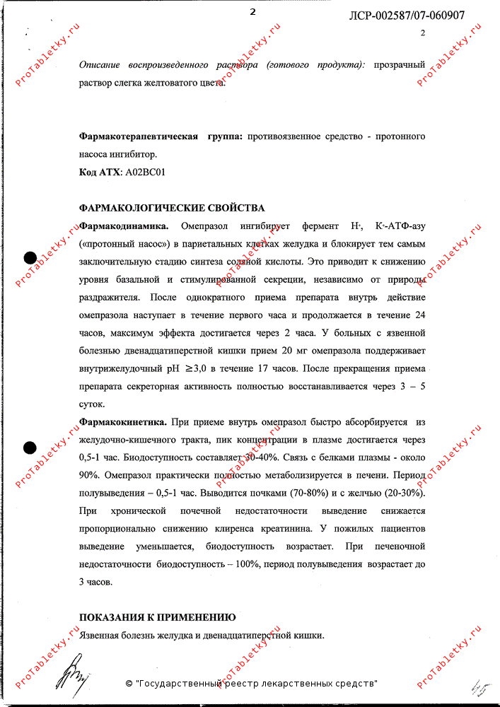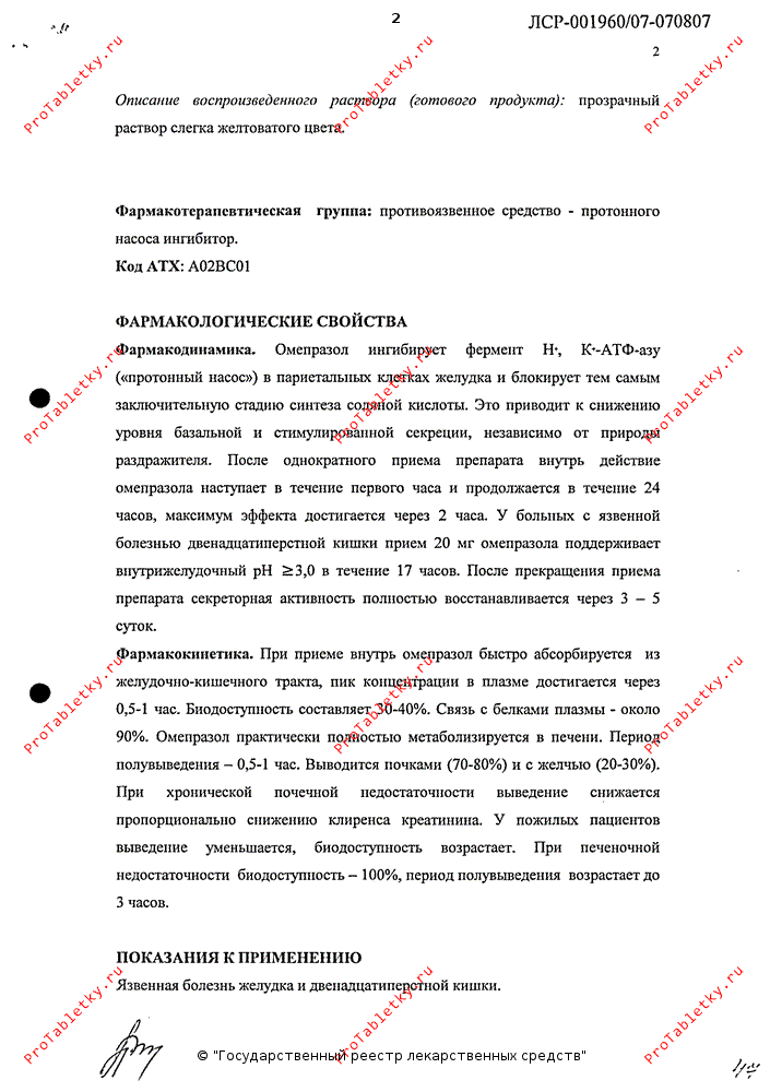 При приеме внутрь омепразол быстро абсорбируется из желудочно-кишечного тракта, Cmax в плазме достигается через 0.5-1 ч. Биодоступность составляет 30-40 %. Связь с белками - около 90%. Омепразол практически полностью метаболизируется в печени. Период полувыведения - 0.5 -1 ч. Выводится почками (70-80%) и с желчью (20-30 %). При хронической почечной недостаточности выведение снижается пропорционально снижению клиренса креатинина. У пожилых пациентов выведение уменьшается, биодоступность возрастает. При печеночной недостаточности биодоступность - 100%, T1/2 возрастает до 3 ч.Форма выпуска