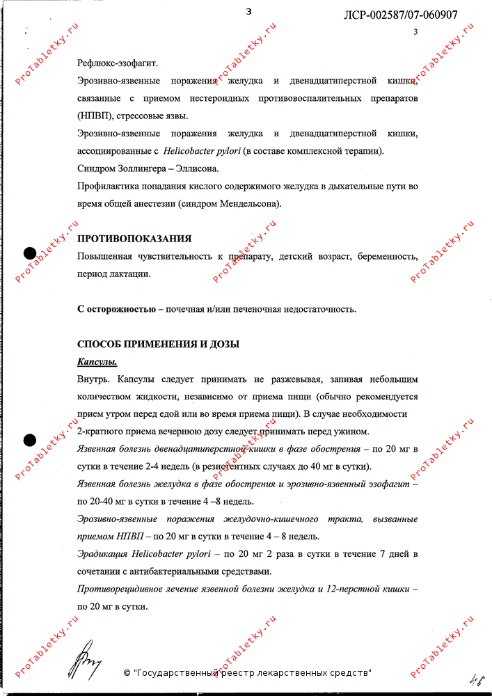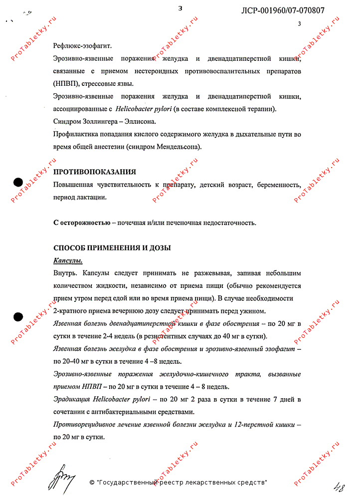 Эрадикация Helicobacter pylori - по 20 мг 2 раза/сут в течение 7 дней в сочетании с антибактериальными средствами.
