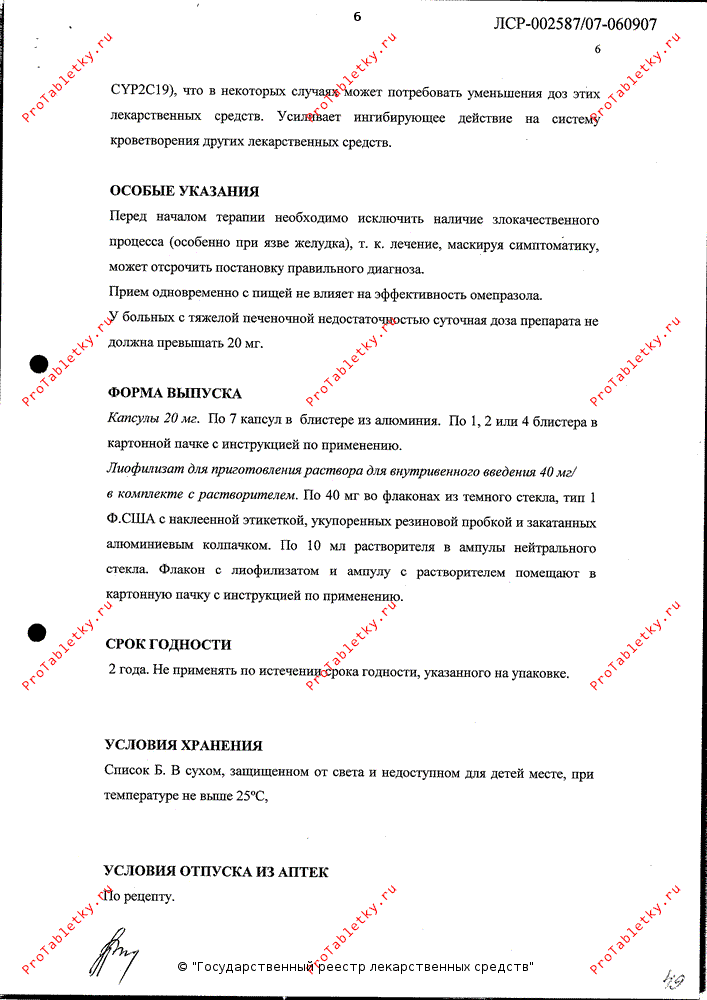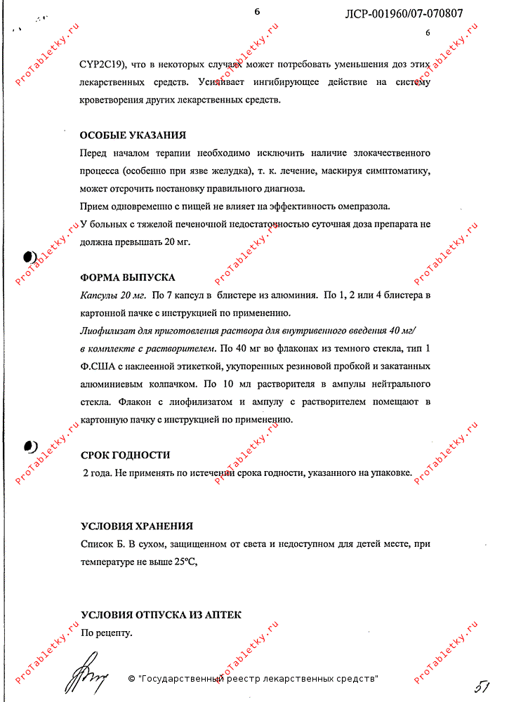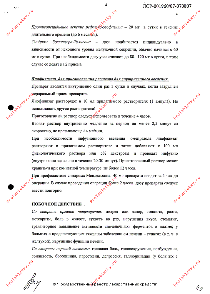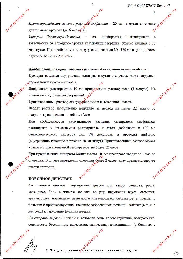 При необходимости инфузионного введения омепразола лиофилизат растворяют в прилагаемом растворителе и затем добавляют к 100 мл физиологического раствора или 5% декстрозы и проводят инфузию (в/в капельно в течение 20-30 минут). Приготовленный раствор может храниться при комнатной температуре не более 12 часов.