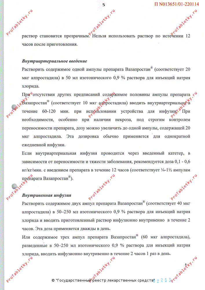 Эффективность. Форма введения. Цена. Вазапростан - эффективный лекарственный препарат для снижения симптомов критической ишемии нижних конечностей. Может применяться в комбинации с хирургическим лечением или в качестве комбинированной таблетированной терапии. Обладает выраженным сосудорасширяющим действием, воздействует преимущественно на мелкие сосуды. Обладает незначительным антиагрегантным действием, что необходимо учитывать при назначении. Может вызывать синдром обкрадывания, что необходимо учитывать при назначении пациентам с заболеваниями сердца - возрастает риск усиления стенокардии. | |||||||||