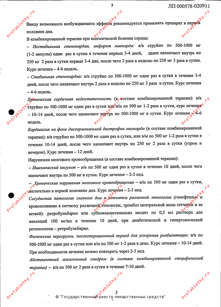 Стабильная стенокардия: в/в струйно по 500-1000 мг 1 раз/сут в течение 3-4 дней, после этого назначают внутрь 2 раза в неделю по 250 мг 3 раза/сут. Курс лечения - 4-6 недель.