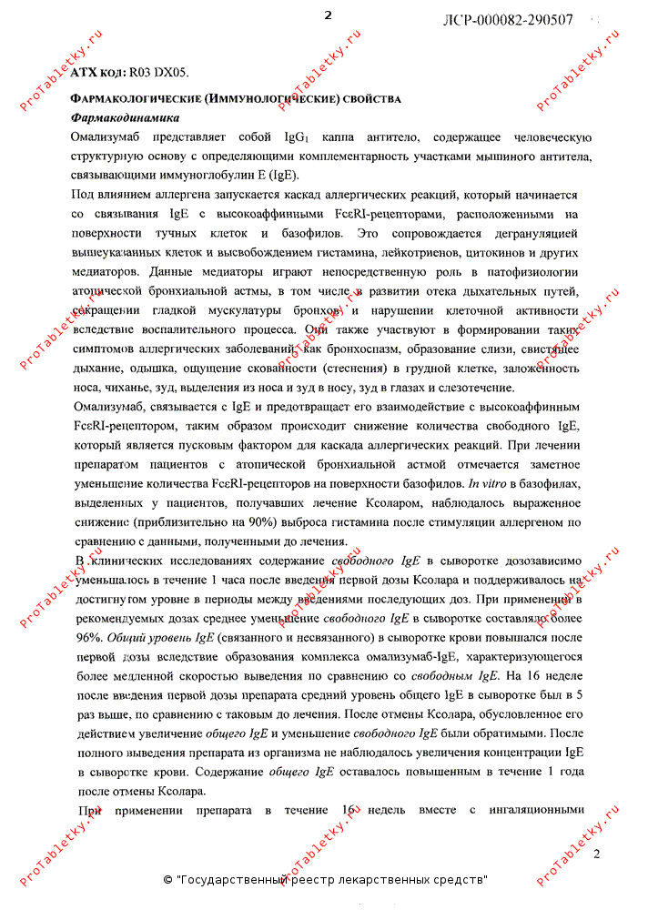 У пациентов с бронхиальной астмой и круглогодичным аллергическим ринитом, получавших терапию ГКС, при применении омализумаба в течение 28 недель отмечалось снижение выраженности симптомов бронхиальной астмы и круглогодичного аллергического ринита, а также улучшение параметров легочной функции. Уменьшение частоты обострений бронхиальной астмы и улучшение качества жизни больных (по сертифицированному опроснику качества жизни) на фоне терапии препаратом Ксолар сохранялось в течение длительного времени по сравнению с плацебо.