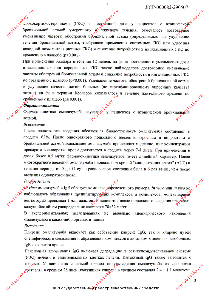 введением очередной дозы поддерживалось на достигнутом уровне в период между 12 и 24 неделями лечения. Содержание общего IgE в сыворотке крови повышался после первой дозы вследствие образования комплекса омализумаб- IgE, характеризующегося более медленной скоростью выведения по сравнению со свободным IgE. После повторного введения препарата 1 раз каждые 4 недели в дозе от 75 мг до 300 мг, содержание общего IgE в сыворотке крови на 12 неделе от начала лечения было в 2-3 раза выше, по сравнению с таковым до лечения и поддерживалось на достигнутом уровне в период между 12 и 24 неделями лечения. После отмены препарата Ксолар, в течение 16 недель последующего наблюдения,