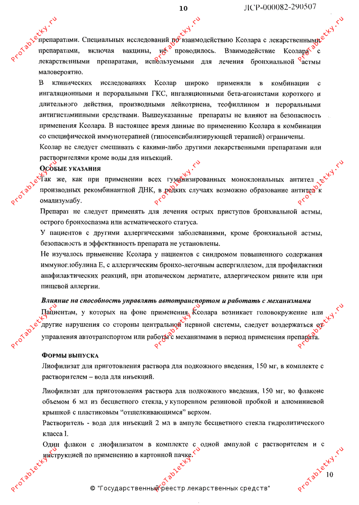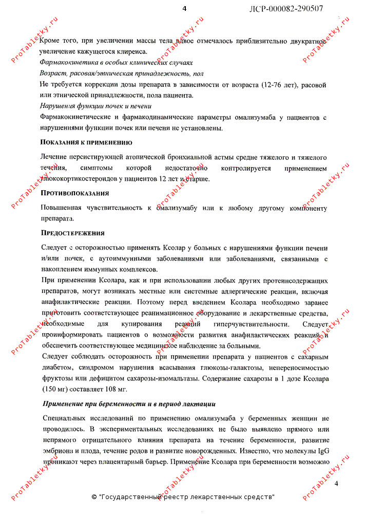Возможно участие IgE в иммунном ответе при развитии гельминтных инфекций. В плацебо-контролируемых исследованиях у пациентов с аллергическими заболеваниями с риском развития гельминтных инфекций при применении препарата Ксолар отмечалась небольшое повышение частоты возникновения гельминтозов (однако течение, тяжесть заболевания и ответ на терапию не изменялись). Общая частота развития гельминтных инфекций во всех клинических исследованиях была менее 1 из 1000 (дизайн исследований не включал специальное изучение частоты развития гельминтных заболеваний).
