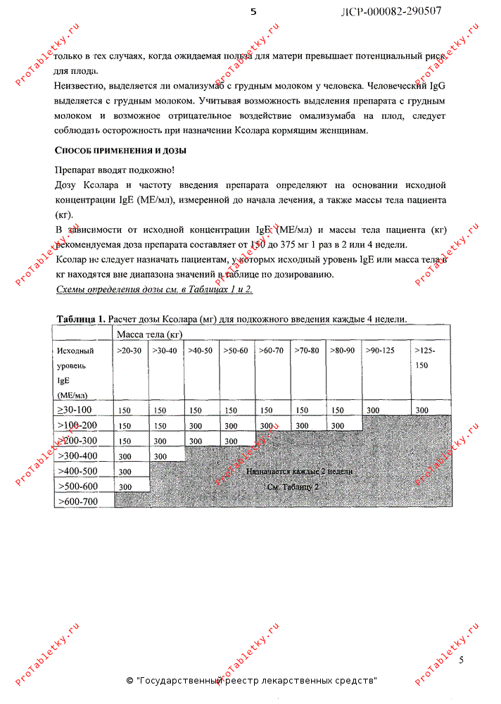 Дозу Ксолара и частоту введения препарата определяют на основании исходной концентрации IgE (МЕ/мл), измеренной до начала лечения, а также массы тела пациента (кг). В зависимости от исходной концентрации IgE (МЕ/мл) и массы тела пациента (кг) рекомендуемая доза препарата составляет от 75 мг до 600 мг 1 раз в 2 или 4 недели (таблицы 2 и 3).