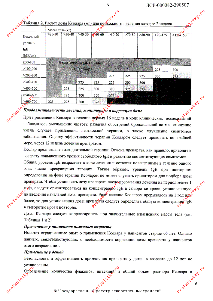 Препарат Ксолар не следует применять пациентам, у которых исходный уровень IgE или масса тела находятся вне диапазона значений в таблице по дозированию.
