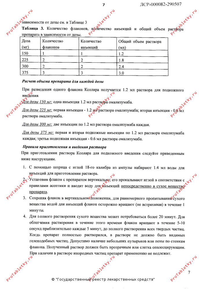 Определение количества флаконов, инъекций и общий объем раствора препарата Ксолар в зависимости от дозы представлены в таблице 1.