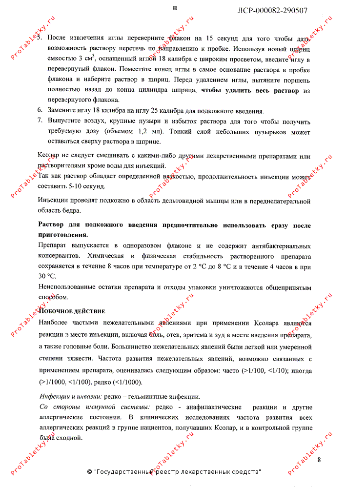 Наиболее частыми нежелательными явлениями при применении препарата Ксолар являются реакции в месте введения инъекции, включая боль, отек, эритему и зуд в месте введения препарата, а также головную боль.